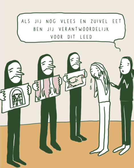 “Als jij niet vegan bent, ben jij verantwoordelijk voor dierenleed”. Is dat een boodschap die de vleeseter direct bekeert? Of bereik je daarmee juist het tegenovergestelde? Esther vraagt het zich af. Ze loopt twee dagen mee met de straatactivisten van Anonymous for the Voiceless. Deze van oorsprong Australische organisatie is actief in meer dan 400 steden wereldwijd. Op straat tonen zij de voorbijgangers beelden uit de bio-industrie en spreken ze hen aan over hun vleesconsumptie. De gesprekken zijn direct en confronterend, met als kern: houd de persoon verantwoordelijk voor dierenleed.